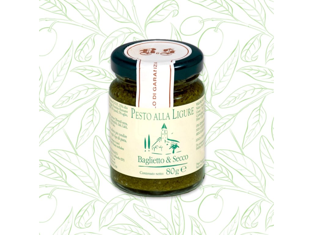 Složení: 53 % bazalka, 25 % extra panenský olivový olej, 10 % sýr Pecorino Romano DOP (ovčí mléko, sůl, syřidlo), 10 % piniové oříšky, 2 % sůl. Průměrné nutriční hodnoty na 100 g výrobku: Energie: 644 kcal – 2695 kJ – Tuky: 70,8 g, z toho nasycené mastné kyseliny: 16,13 g – Sacharidy: 1,2 g, z toho cukry: 0,5 g – Vláknina: 0,9 g – Bílkoviny: 1,1 g – Sůl: 4,97 g. Před použitím obsah promíchejte.